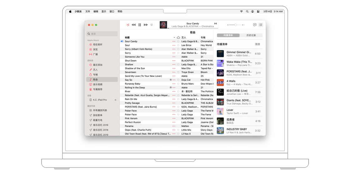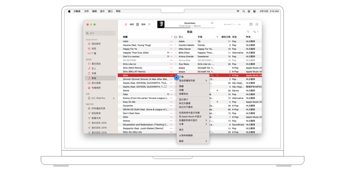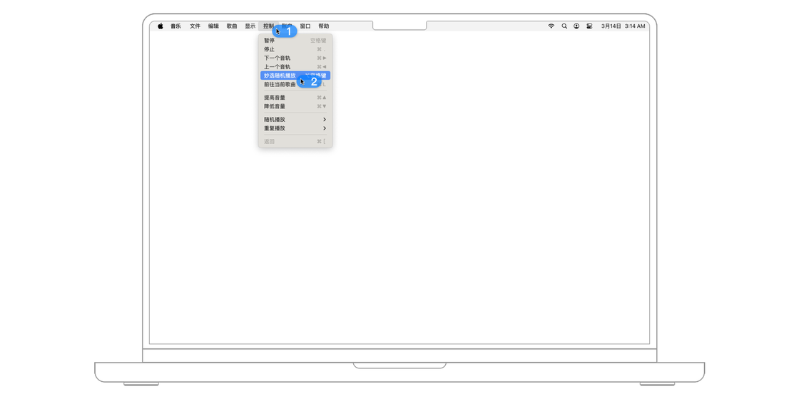 一种是「妙选随机播放」,Apple Music 将选取一首歌并播放与之完美搭配的歌。打开方式很简单,只需点击菜单栏的「控制 > 妙选随机播放」或使用「Option + 空格键」快捷键打开即可。