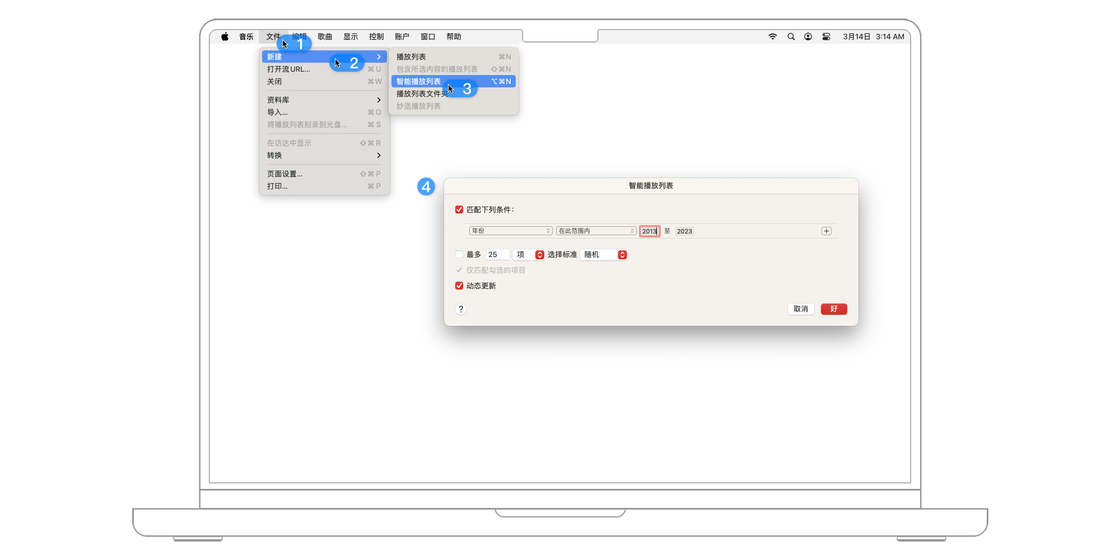 除此之外,我们还可以创建「智能播放列表」,为列表指定筛选标准,通过设定不同的规则及其范围来控制智能播放列表。