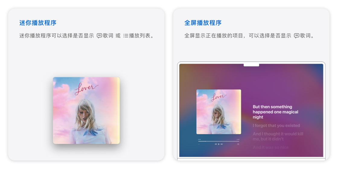 除了在标准窗口显示之外,我们还可以通过菜单栏的「窗口」切换到「迷你播放程序」或「全屏播放程序」。而在「迷你播放程序」中,我们还可以选择是否「显示歌词」和「播放列表」。