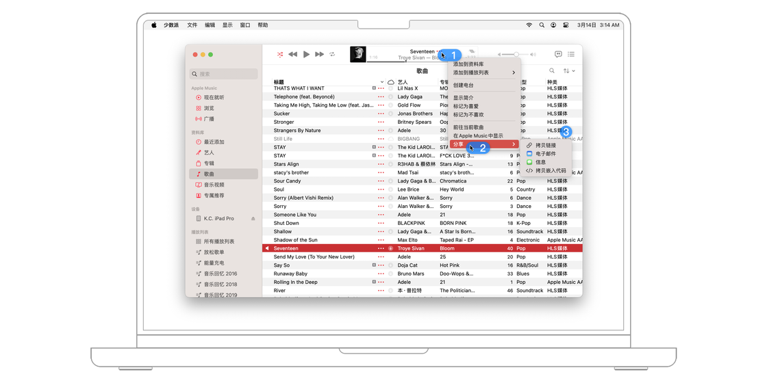 无论是歌曲、专辑、歌单还是电台,都可以点击「...」按钮,然后选择「分享」将其发送到不同的平台。与 iOS 上的「分享」包括「隔空投送」和「链接分享」 不同的是,macOS 版本的「分享」只包括「拷贝链接」「电子邮件」「信息」「拷贝嵌入代码」四种方式,而没有「隔空投送」的选项。