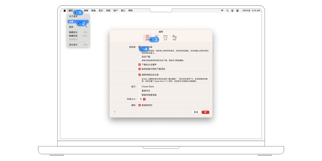 在 Mac 上打开同步资料库的功能:打开 Apple Music,再从屏幕顶部的菜单栏中选择「音乐 > 设置... 」,进入「通用」并勾选「同步资料库」。
