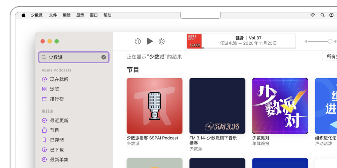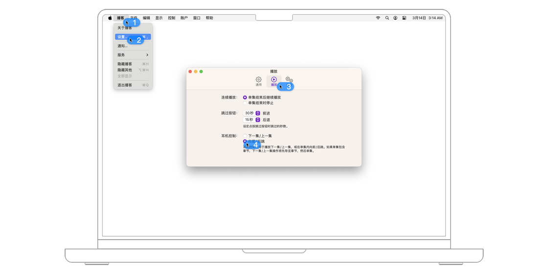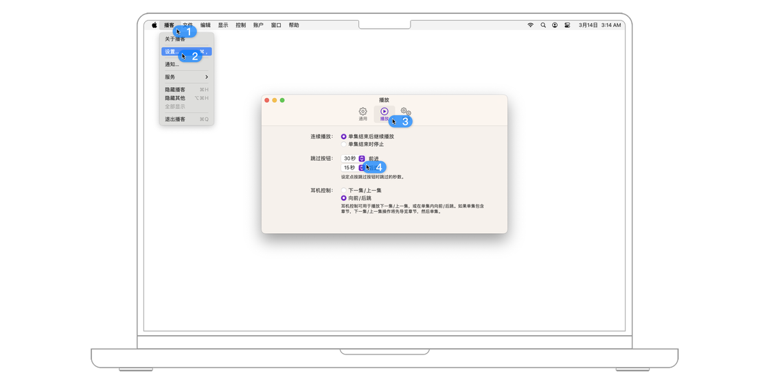 如果 Mac 电脑连接到了耳机等外部设备,按下外部设备上的「上一曲」或「下一曲」按钮也可以控制播客的播放。想要设置此时是切换「上一集/下一集」还是「前进一定秒数/后退一定秒数」,可以前往「设置 > 播放」,并在「耳机控制」一节改变设定。