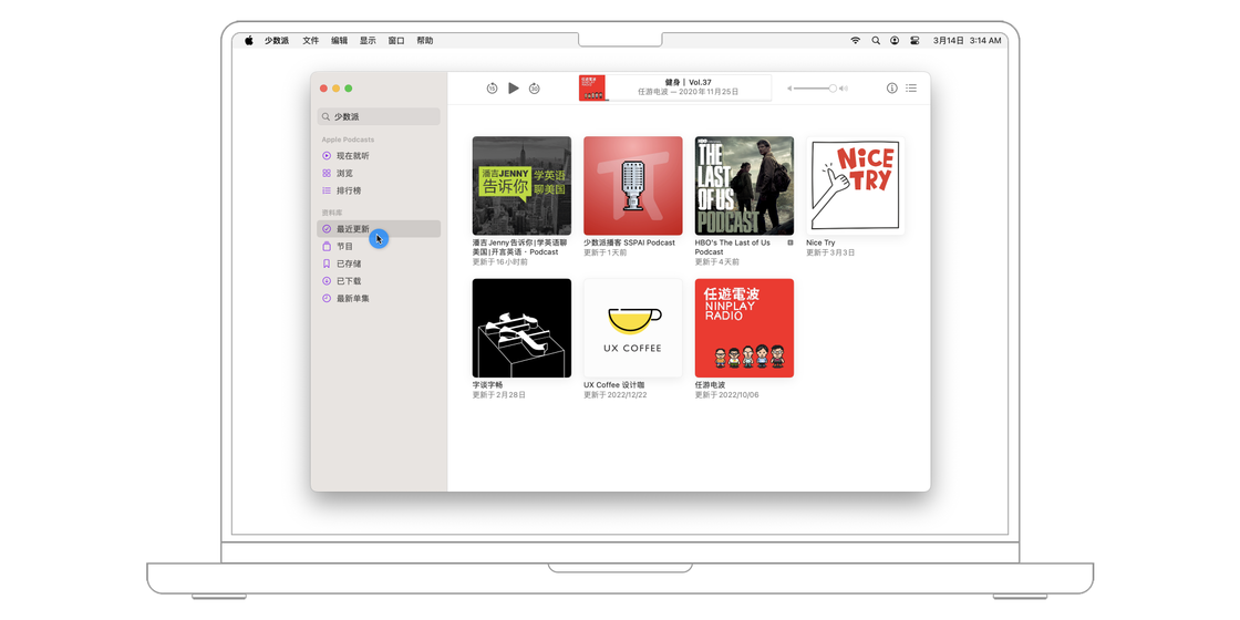 想要查看已经关注的播客节目最新发布的单集,可以前往播客 app 侧边栏的「资料库」面板,并轻点「最近更新」。