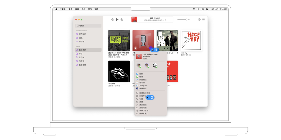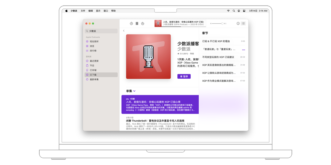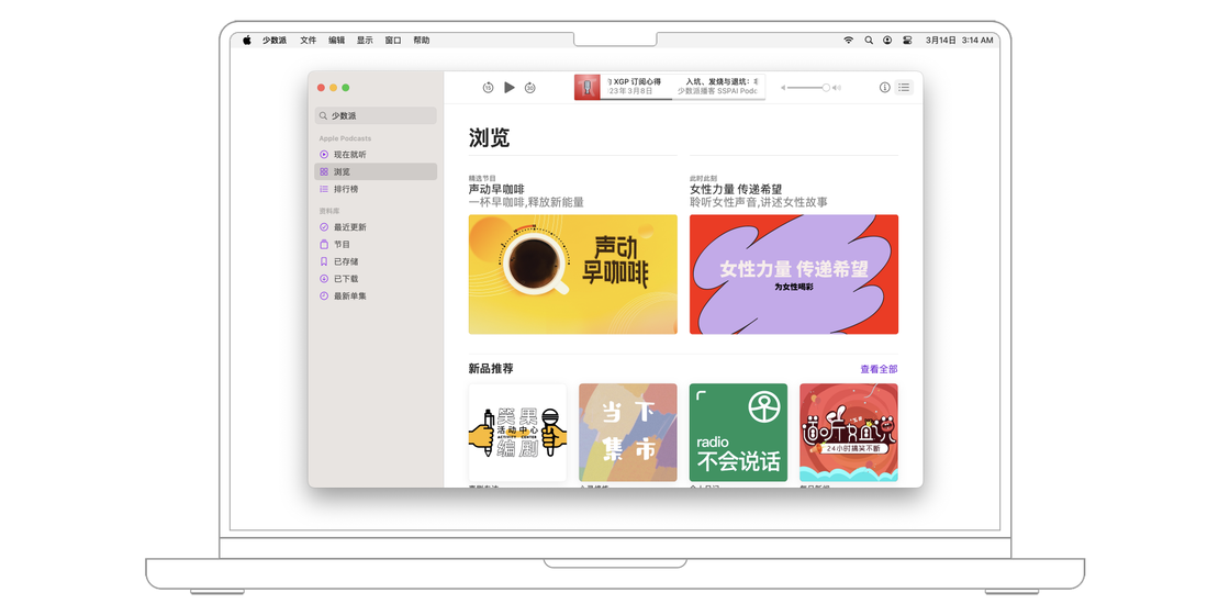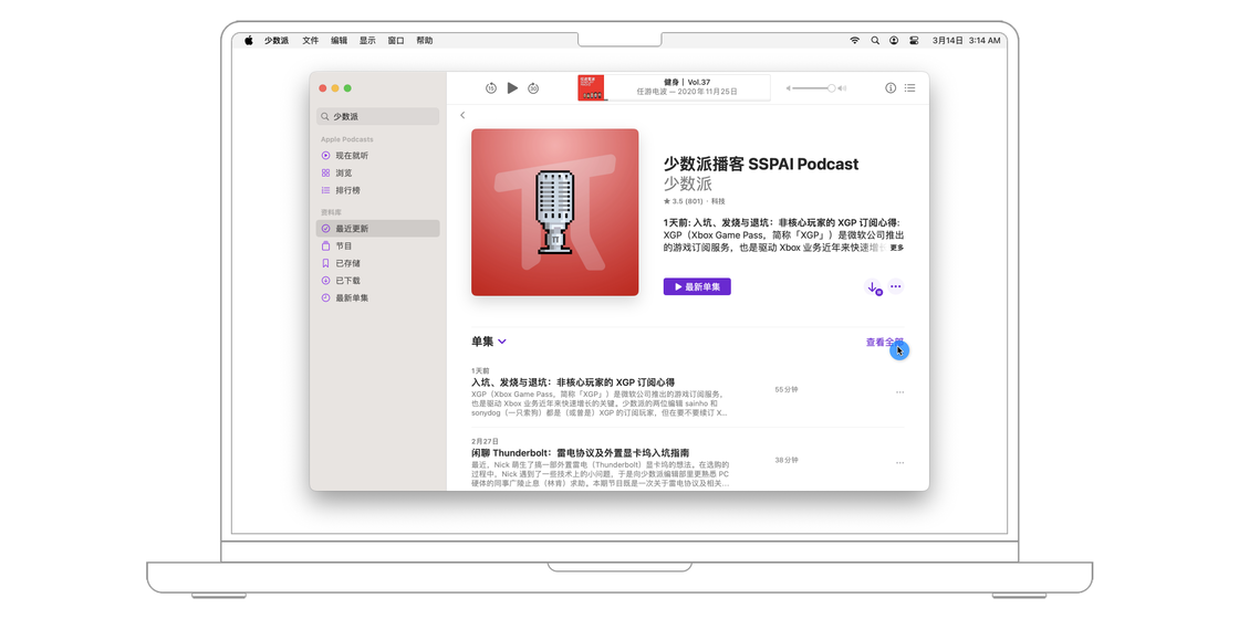 想要关注一档播客节目,最常见的方法是直接点击播客制作者提供的链接。此时,macOS 系统会自动跳转到播客 app,并打开相关节目的详情页面,点击「+关注」按钮就能将该播客添加到资料库。如果在菜单栏的「设置 > 通用」中打开「同步资料库」,则收藏的节目将在登陆了相同 iCloud 账号的设备之间同步。