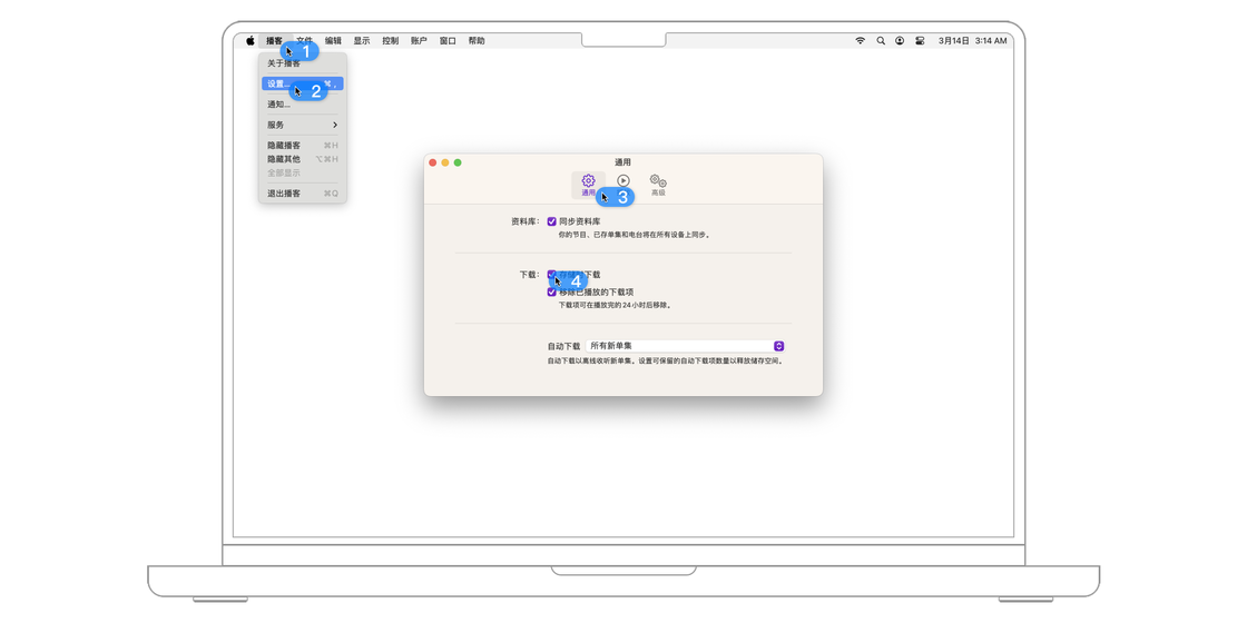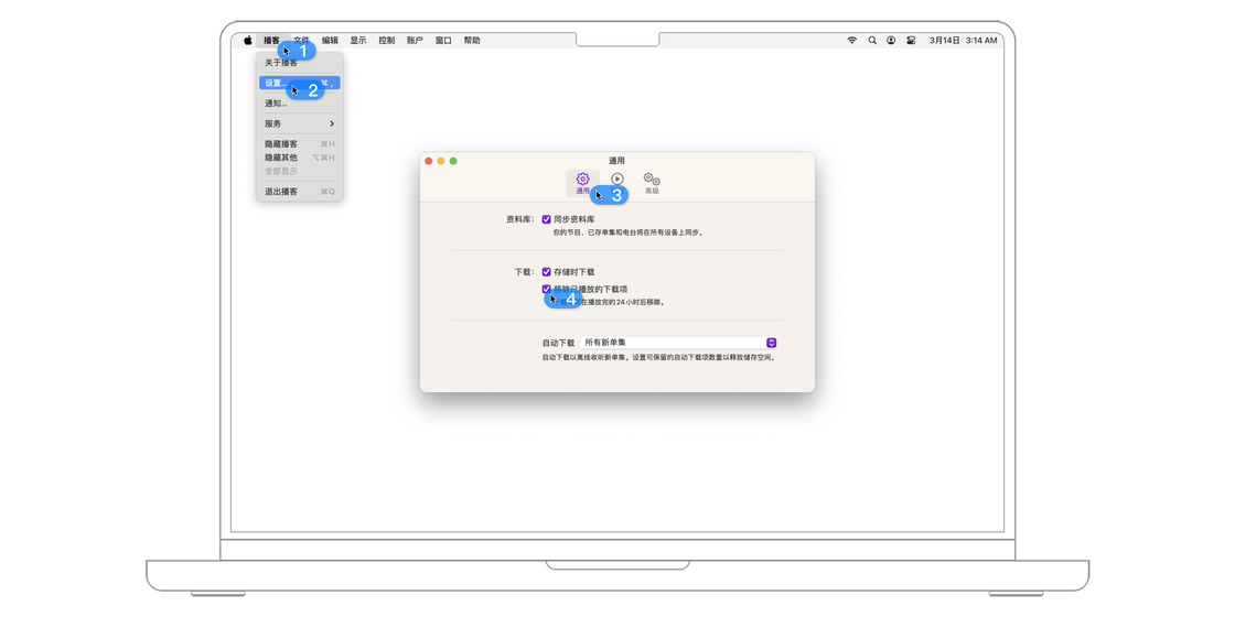 如果想要在关注后自动下载该节目的单集,可以前往菜单栏的「设置 > 通用」,在「自动下载」处选择每个节目的最新单集、每个节目的最新 2 集、过去 30 天等不同的选项。
