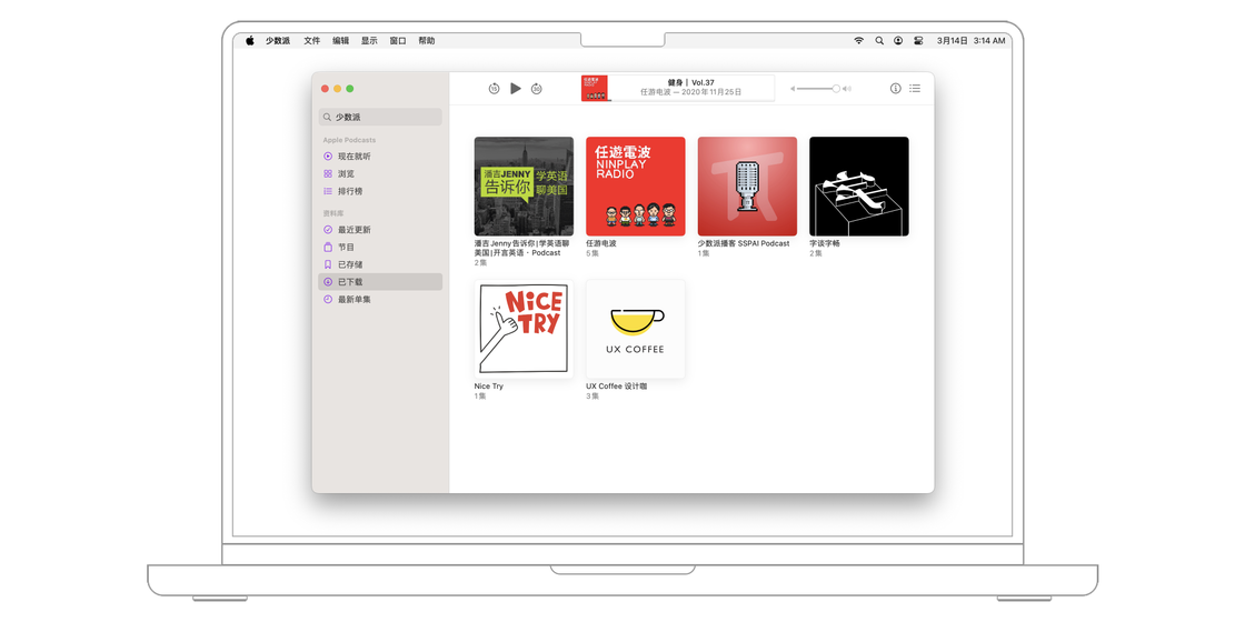 想要查看已经下载的单集,可以前往播客 app 侧边栏的「资料库」面板,并轻点「已下载」。