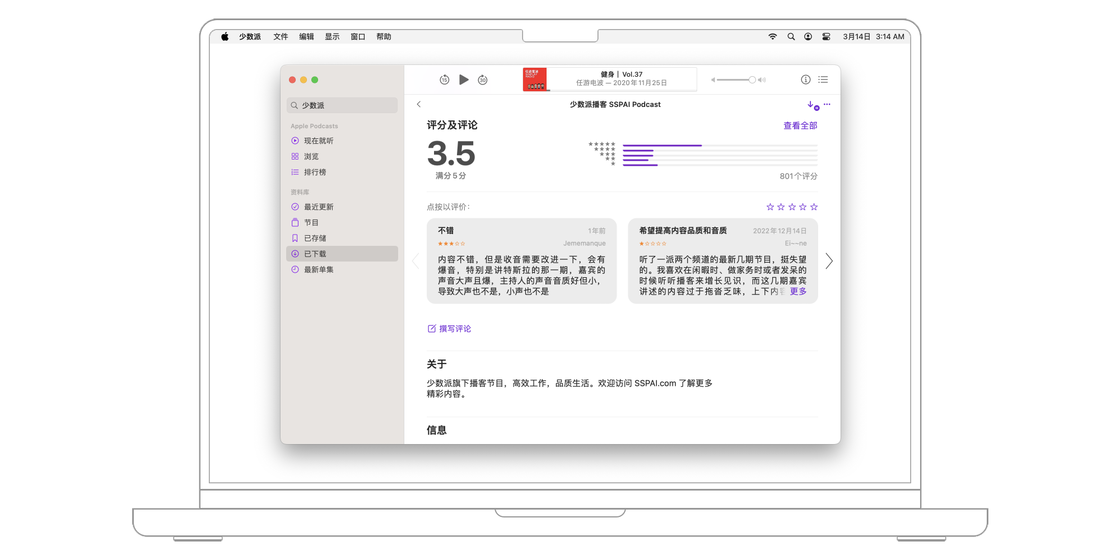 在播客节目介绍的下方有播客主持人、嘉宾、评分等更多信息,类似于 App Store 中的 app 详情页面。