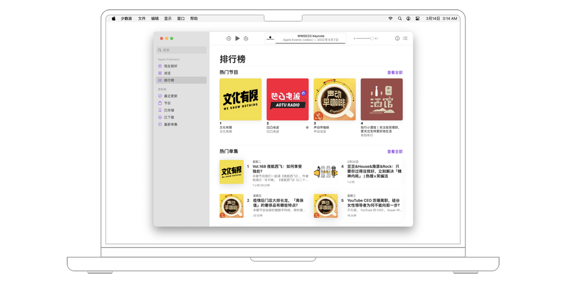 前往播客 app 的「排行榜」面板可以找到热门节目、热门单集、热门订阅节目、热门订阅频道等类别下的最佳播客节目。