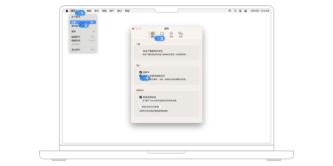 图书导入后,如果你打开了 iCloud 图书功能,那么书库中的所有图书,以及它们的阅读进度,都会自动在你用同一个 Apple ID 登录 iCloud 的 iOS、iPadOS 和 macOS 设备之间同步。在菜单栏中依次点击「图书 > 设置...」,然后在通用窗口中勾选启用同步下的「阅读中」和「藏书、书签和高亮标记」两个选项。
