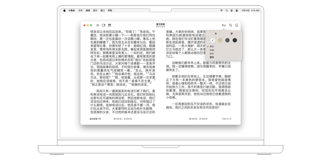 你可以通过右上角的「大小」按钮来自定义自己的阅读体验,其中包括屏幕亮度、字体大小、字体、背景主题。