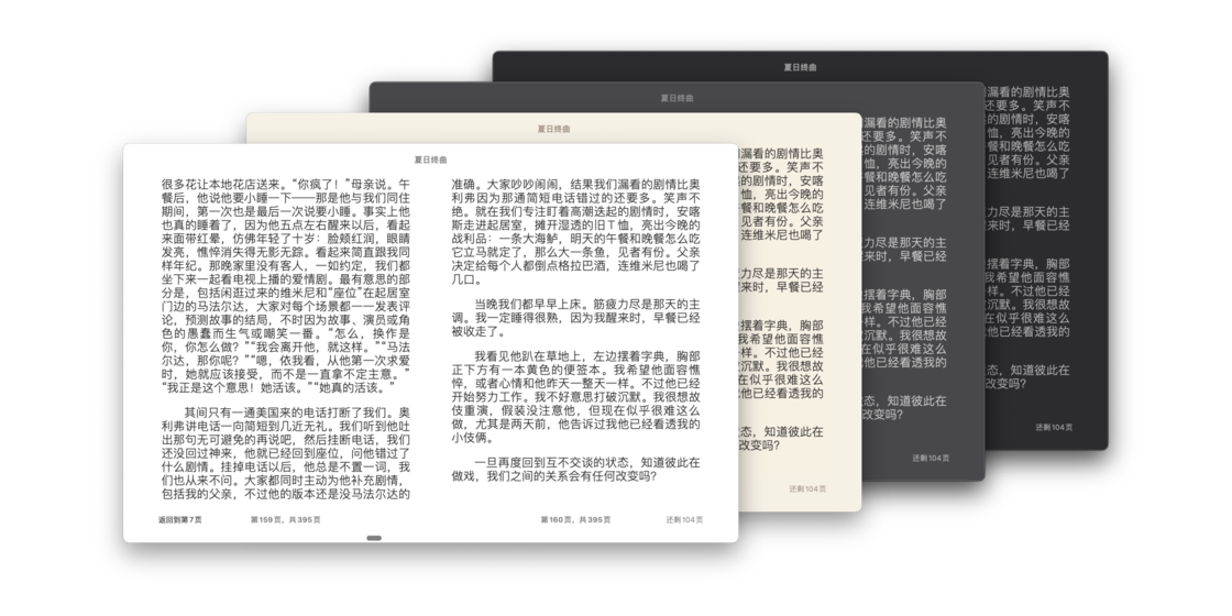 书籍的主题有 4 款可供选择,分别为白色、黄色、灰色和黑色,需要手动进行切换,并且不会收到系统深色主题切换的影响。