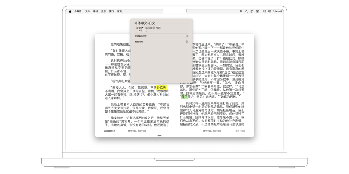 「图书」内置了 Apple 字典与翻译,可以在看书的时候选中单词,点击「查询所选内容」或者「翻译所选内容」来查询不熟悉的词汇。如果你使用的是 MacBook 系列或者妙控板,那么可以通过 Force Touch 操作来直接查询所选单词的释义。