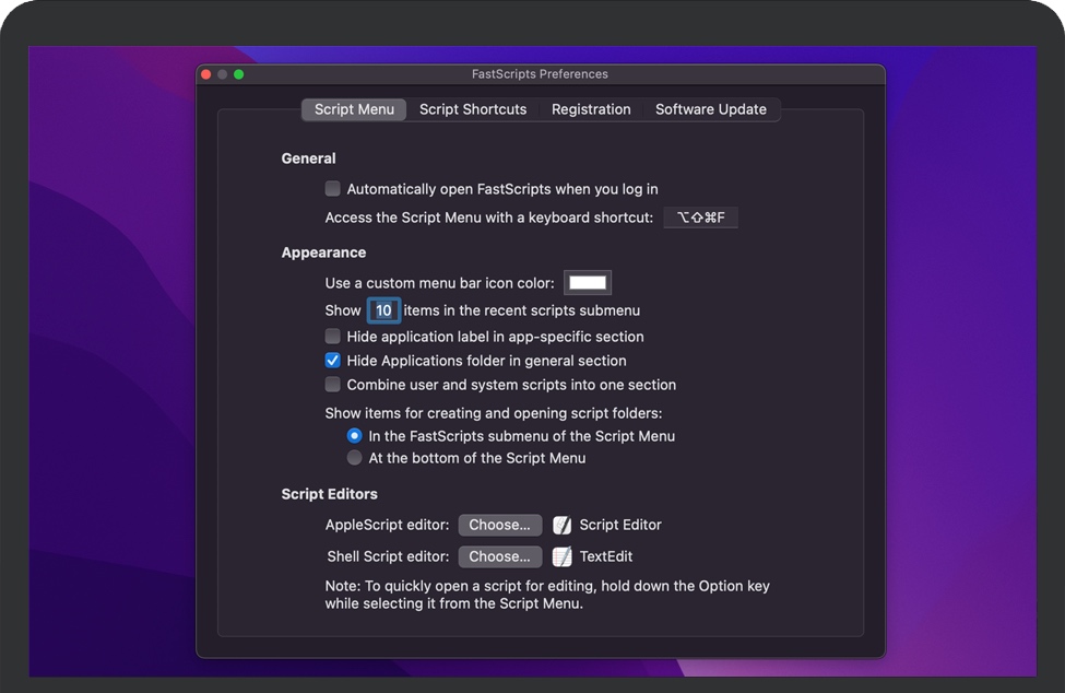 FastScripts 旨在以尽可能方便和“自然”的形式显示您的脚本。Apple 的特定于应用程序的脚本支持将当前应用程序的脚本一直放在菜单底部,使其比任何其他脚本更难导航!在 FastScripts 中,特定于应用程序的脚本显示在菜单顶部的显眼位置,就在您希望找到它们的位置。从 FastScripts 2.1 开始,特定于应用程序的功能也扩展到键盘快捷键!