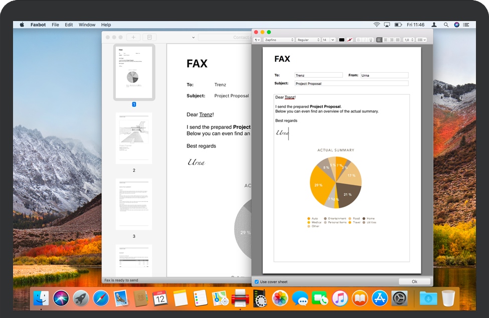 如果要将现有的PDF,PNG或JPEG文件作为传真发送,请将其方便地拖到Faxbot停靠图标或主窗口上。当然,您也可以使用Faxbot中的打开对话框。