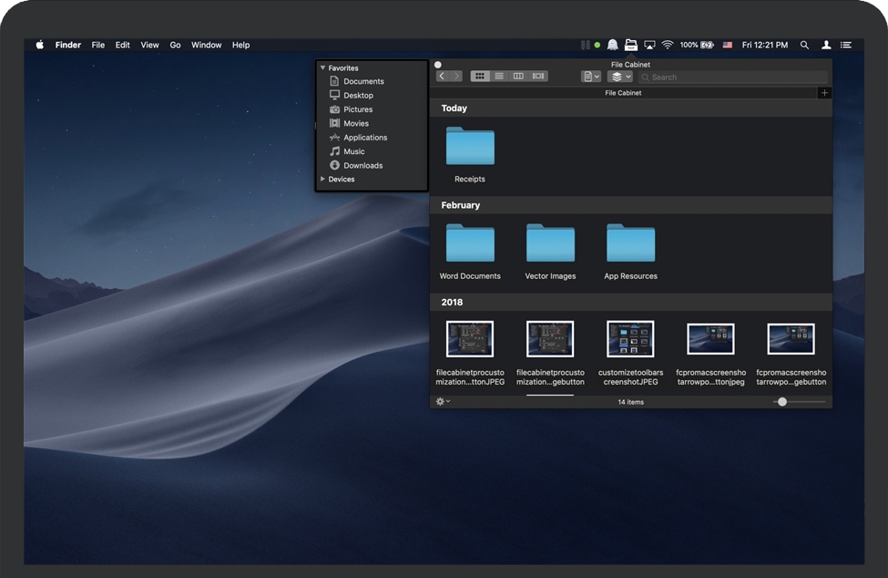 File Cabinet Pro for Mac 是一款 macOS 菜单栏的文件管理器。快速导航到文件而不会弄乱您的桌面。打开、移动、重命名、压缩、标记、删除、复制和粘贴文件,所有这些都来自菜单栏。您可以在 File Cabinet Pro 中本地打开多种文件类型,或通过启动其他应用程序打开文件。在图标视图中单击目录、在列表视图中钻取目录或在列视图中导航文件树都很容易。