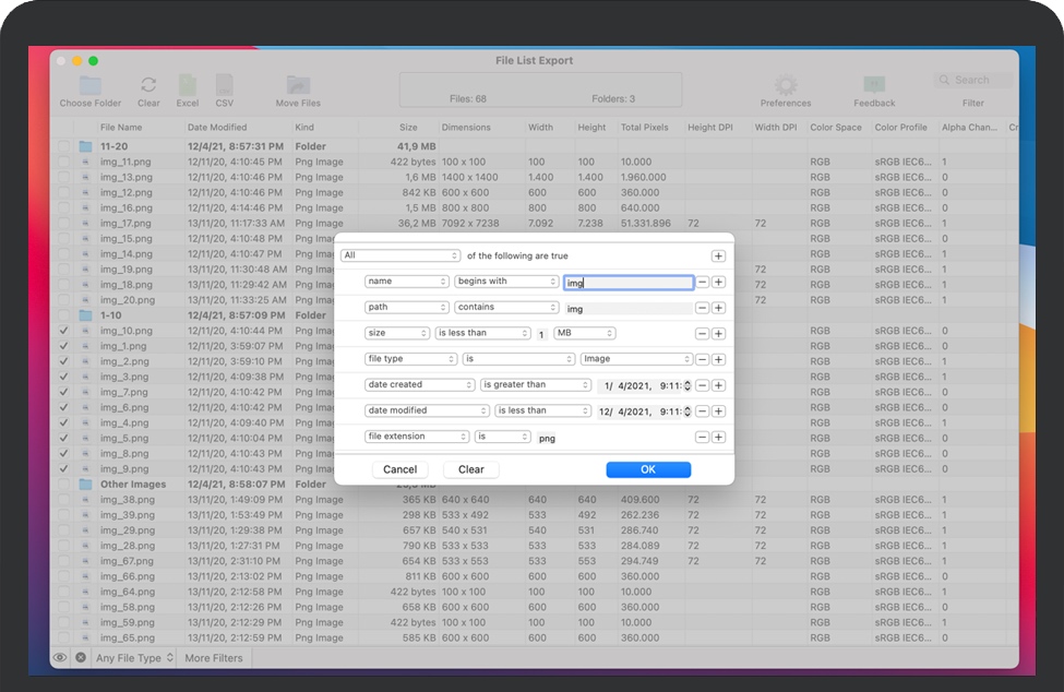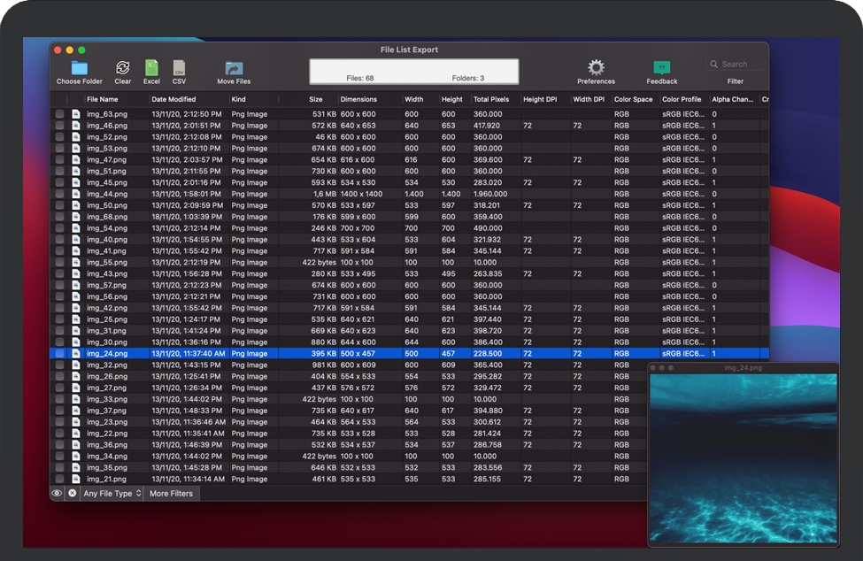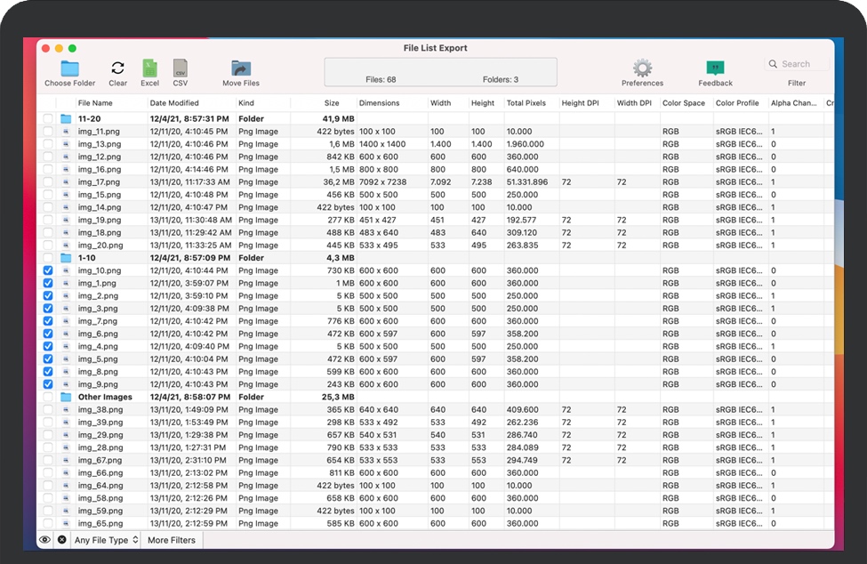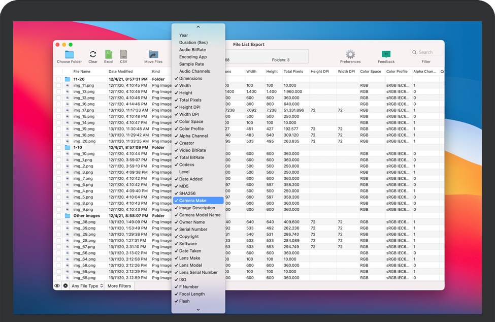 导出到Excel或CSV文件- 将文件列表导出到xls或xlsx,以使用Microsoft Excel或Numbers进行进一步处理。