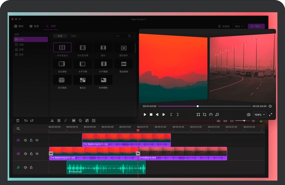 *轨道间无缝衔接。随心添加视频轨道,添加过渡,并在轨道之间自由地移动素材。