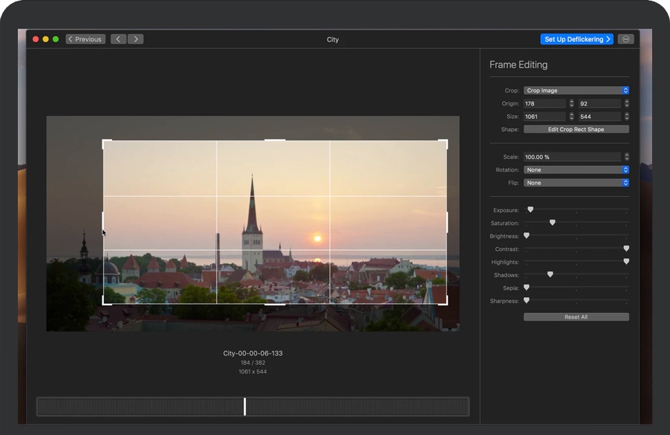 按照以下步骤构建您的专业延时摄影。首先导入您的照片,在应用程序中编辑它们,根据需要激活去闪烁,然后选择导出设置。没有什么比这更容易的了。