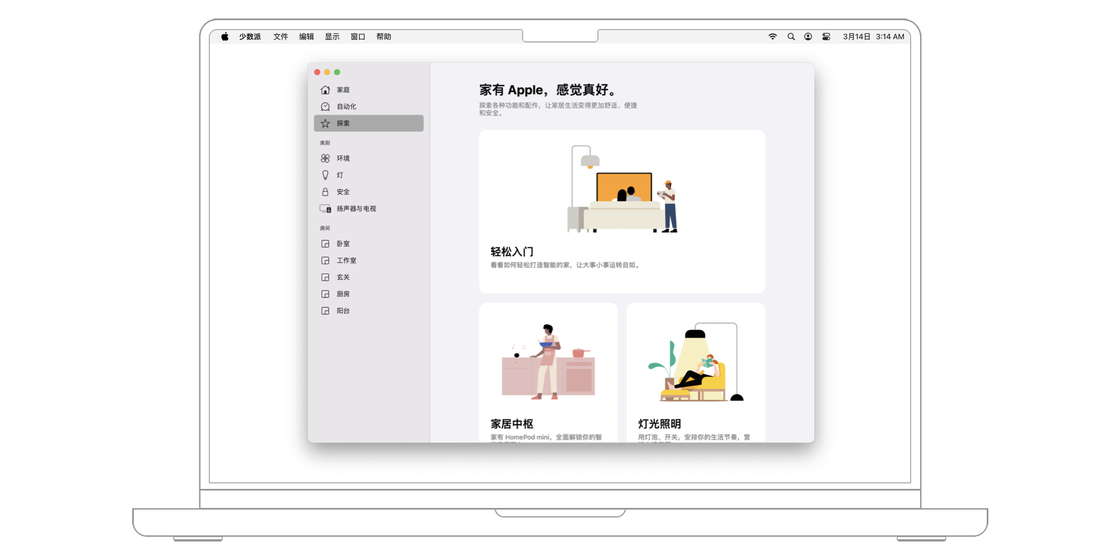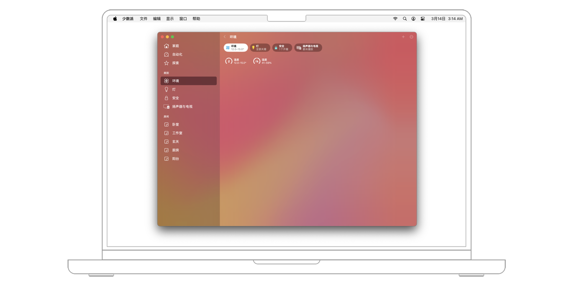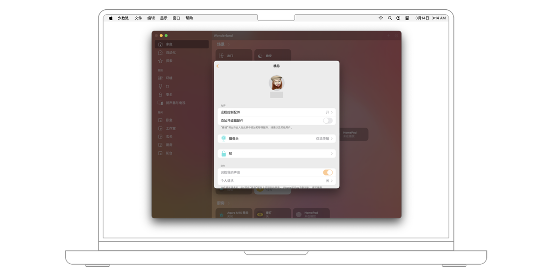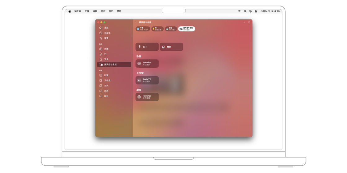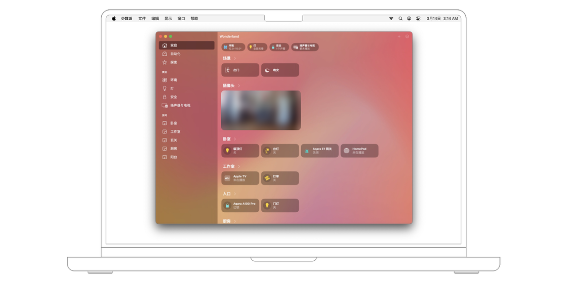 在 macOS 13 版本,家庭 app 的界面采用了与时俱进的全新设计风格,从以往的底部标签页切换界面改成了侧边栏切换界面,令浏览、整理、查看和控制各种配件更加轻松简单。