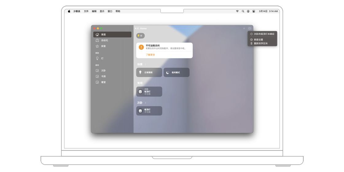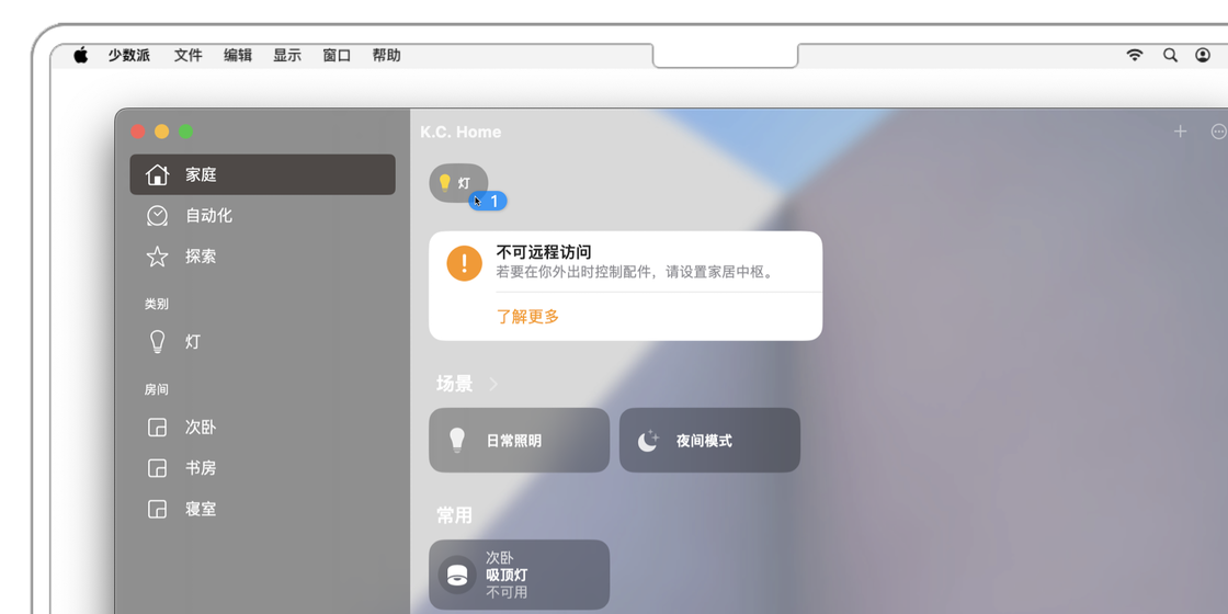 对此,Apple 引入了家居中枢的概念。通过在家庭里设置一个家居中枢,让它为局域网络内的 HomeKit 设备提供远程中继、自动化等功能,这样我们就能在外面以端对端加密的形式访问家庭应用中的设备了。