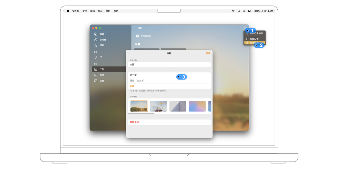 要把房间整理到区域中,需要进入到对应的房间页面中,然后点击家庭应用右上角的的「···」按钮,选择「房间设置」,接着在区域的选项中将它添加到现有的区域或是新建一个自定义区域。