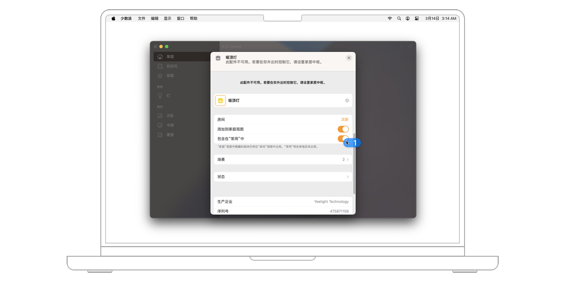 要把它添加到家庭页面的常用设备中也很容易,按照分配房间的操作进入到详细设置中,在房间列表的下方就有一个「包含在“常用”中」的开关选项,打开它,你就可以在家庭页面中找到对应的设备了。