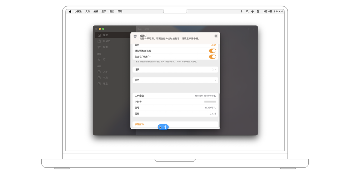 如果一些设备损坏或不再使用时,我们就需要将这些设备移除。在家庭应用中移除设备的操作同样也非常简单,找到对应设备后点击它然后通过右下角的设置按钮进入详细设置,划到最底部就能看到「移除配件」的按钮了。点击它,然后选择「移除配件」即可。