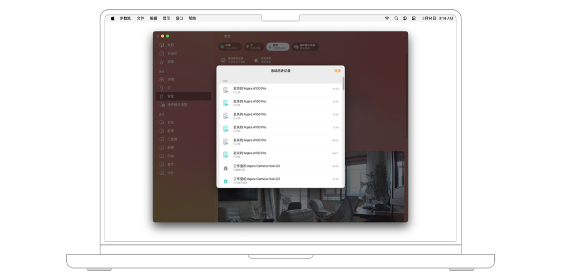 在 macOS Sonoma 中,苹果还为安全类设备加入了查看活动历史记录的功能。这一类设备包括了门锁、安防系统、门窗感应器等,全部可以通过点击主界面顶部的「安全」按钮来一键查看。同样,如果想要查看这一类设备的活动历史记录,点击「安全」按钮后就可以看到「活动历史记录」功能,单击后即可查看每一次设备状态变更的详情。