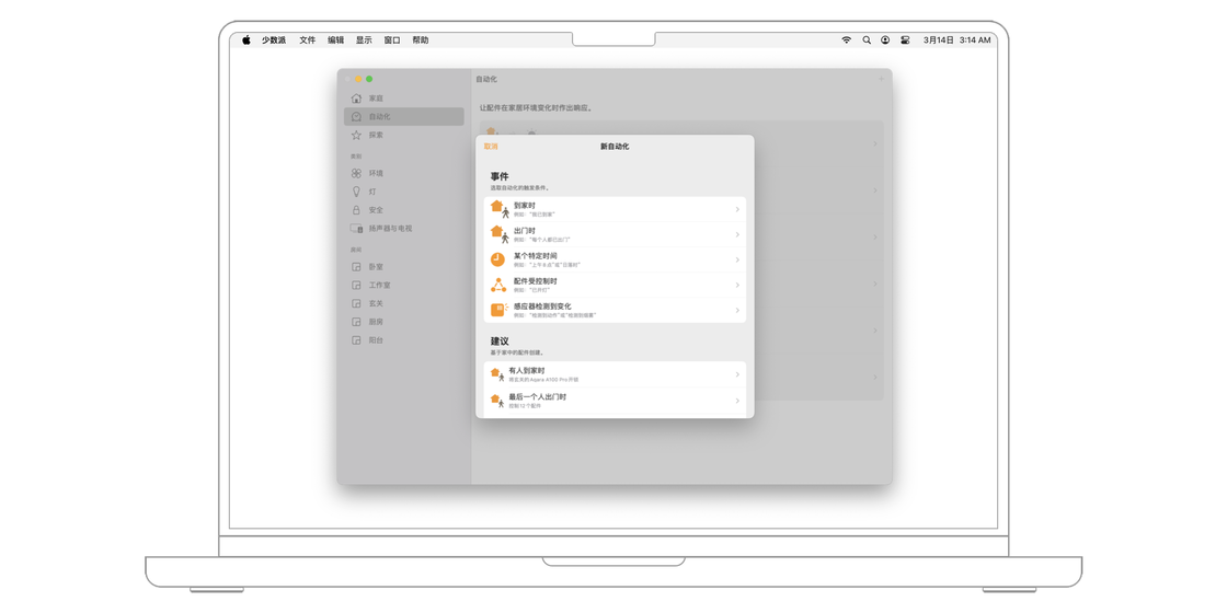 在家庭应用中,我们可以基于各种条件来设定智能家居设备的自动化,而这也是智能家居最让人用了就回不去的点。在我们添加设备时,家庭应用就会给我们推荐一些预配置的自动化,如果我们有需要可以直接打开。不过,大部分的情况下我们会通过创建自己的自动化来实现更加复杂的操作。