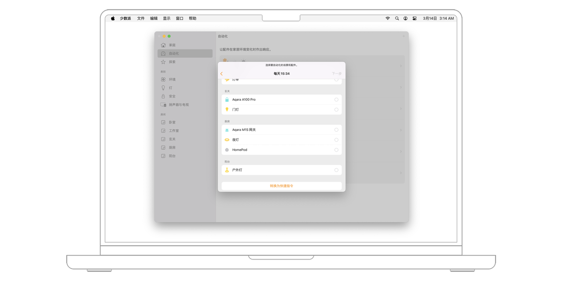 而选择配件的界面下方,我们还可以看到一个「转换为快捷指令」的选项 —— 这同样也是 Apple 生态的一个杀手锏功能。点击它之后,就可以将它转换为一个调用家庭自动化操作触发的快捷指令,这样一来,我们不仅可以控制 HomeKit 智能家居设备,还可以联动 iPhone、iPad 或 Mac 等 Apple 设备或其它应用进行自动化操作,后续的发展前景非常大。