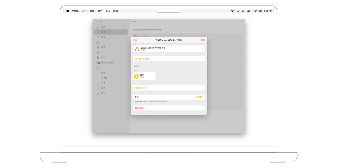 完成了自动化操作的设定之后,就到了最后一步。在详情展示页面,我们可以在最上方为这个自动化命名,并查看对应的触发条件和操作。为了保证自动化能够运行,还可以点击「测试此自动化」,查看它能否正常运行。最后的「关掉」选项,则可以让我们选择通过自动化触发的操作在多长时间后关闭。