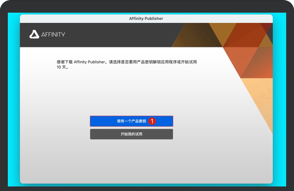 完成后,打开软件【Affinity Publisher】后,如下图,询问是否解锁软件,选择“我有一个产品秘钥”。