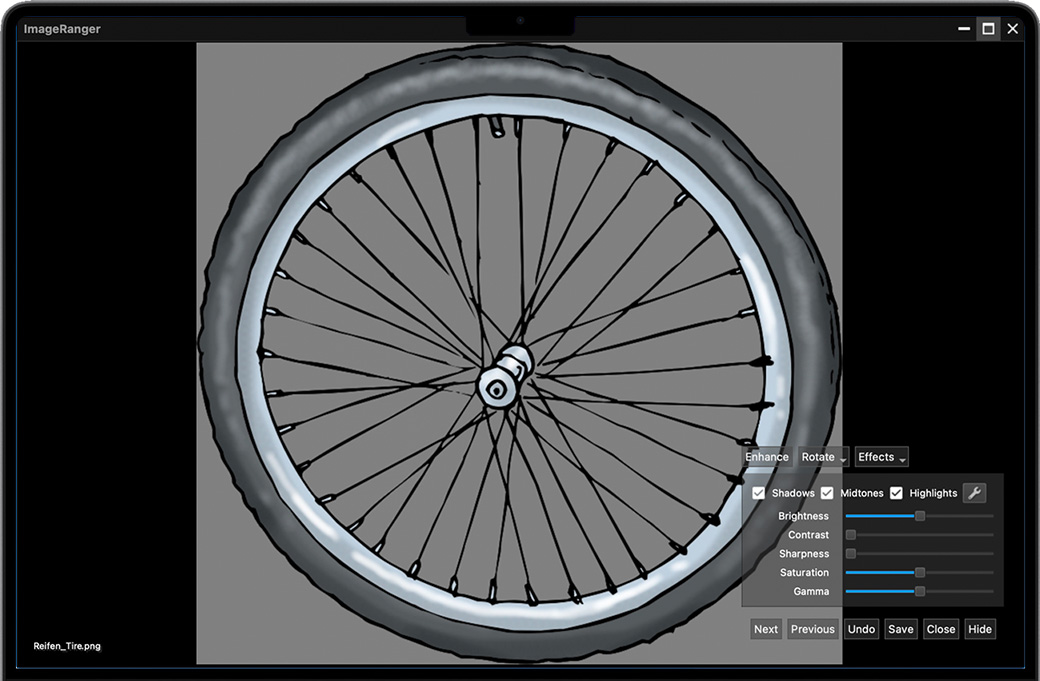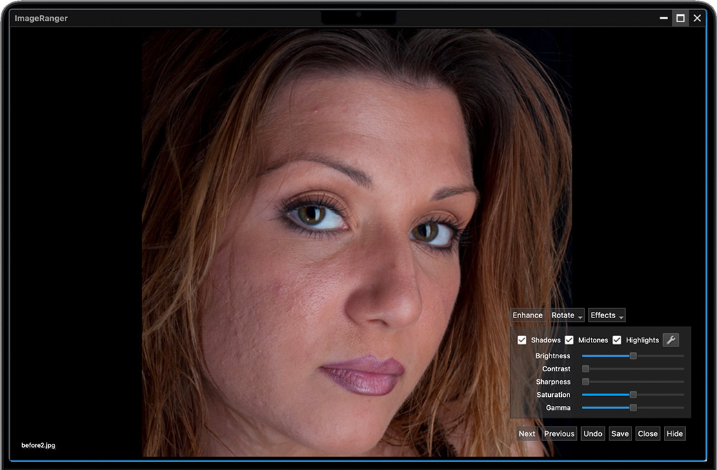 使用 ImageRanger,可以一次将自动增强应用于多个图像。手动微调可以选择图像的暗区或亮区并应用各种校正设置。