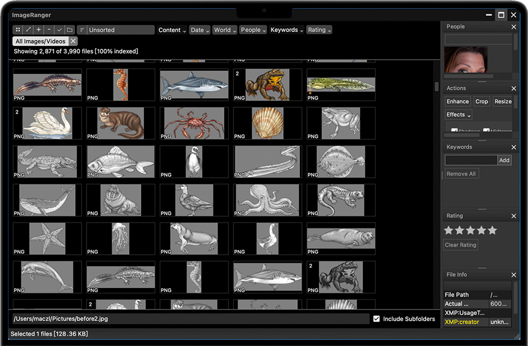 Mac电脑照片和视频太多?ImageRanger Pro for Mac可帮助您对计算机和存储驱动器上的文件进行排序和过滤。使用基于AI的面部识别,可以轻松地将面部标签直接放入图片的 EXIF 元数据中。标记、评价照片是小菜一碟。当您需要浏览大型媒体收藏时,该软件可为您节省大量时间。一旦您的文件被索引,排序图像和视频就变得简单快捷。