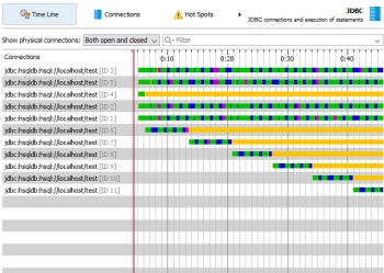 数据库调用是业务应用程序中出现性能问题的首要原因。JProfiler 的 JDBC 和 JPA/Hibernate 探针以及用于 MongoDB、Cassandra 和 HBase 的 NoSQL 探针显示了数据库访问缓慢的原因以及您的代码调用语句的速度有多慢。从向您显示所有 JDBC 连接及其活动的 JDBC 时间线视图,到向您显示慢语句的热点视图到各种遥测视图和单个事件列表,数据库探针是深入了解数据库层的重要工具。