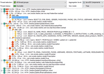 JProfiler 中的大多数视图都提供了对 JEE 的专门支持。例如,在 JEE 聚合级别中,您可以根据应用程序中的 JEE 组件查看调用树。此外,调用树被拆分为每个请求 URI。此外,JProfiler 在低级分析数据之上添加了一个语义层,如 CPU 分析视图中显示的 JDBC、JPA/Hibernate、JMS 和 JNDI 调用。凭借其 JEE 支持,JProfiler 弥合了代码分析器和高级 JEE 监控工具之间的差距。