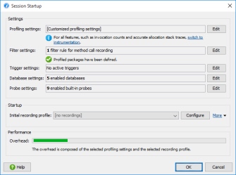 JProfiler 仅在您需要时记录数据。事实上,您可以使用 JProfiler 代理启动您的应用程序,并在稍后附加 JProfiler GUI。当您不记录任何数据时,开销非常小。这就是我们所说的按需分析。在高级分析器中,您总是可以调整很多东西。JProfiler 向您展示您的分析设置将如何影响性能,并为您提供模板以快速选择常见用例的分析设置。