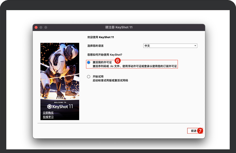 语言选择完成之后,选择“激活我的许可证”之后点击“前进”按钮继续后面的步骤。