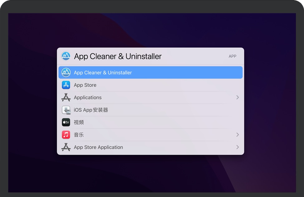 通过名称的简短首字母缩略词查找项目(例如,系统偏好设置的 SP)。
