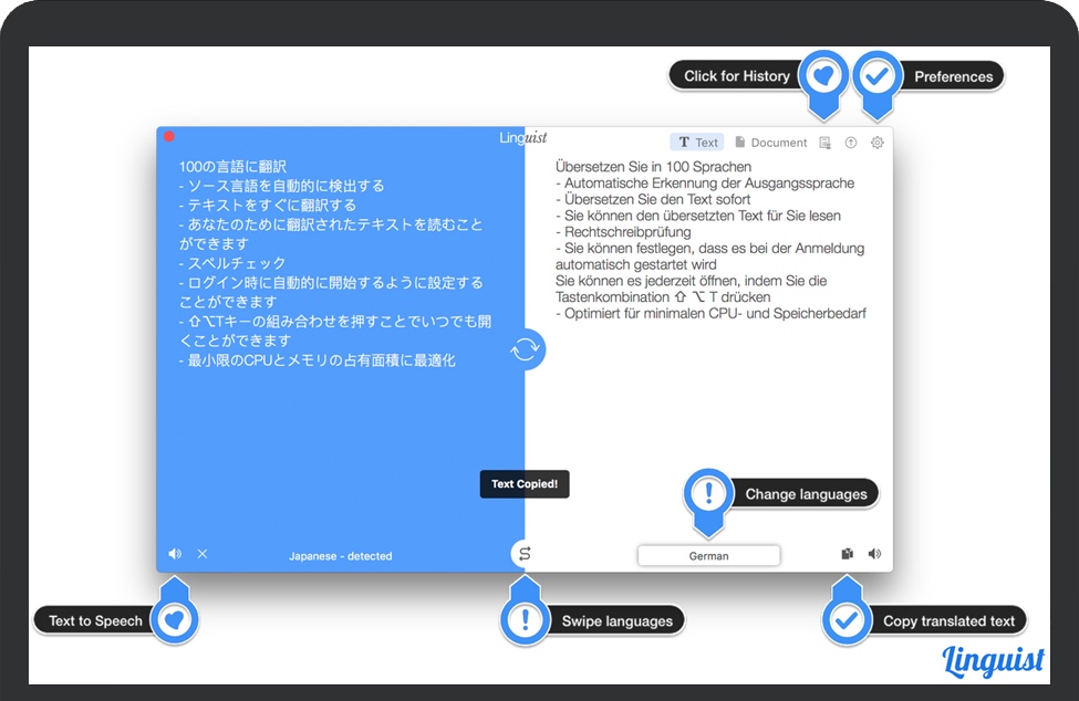 Linguist易于使用翻译工具,还可以从菜单栏(状态栏)或窗口快速翻译。