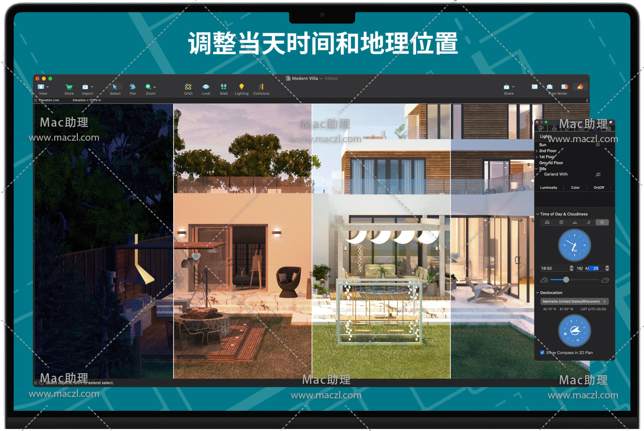 - 设置真实地理位置、一天中的时间和阴天以获得自然照明。