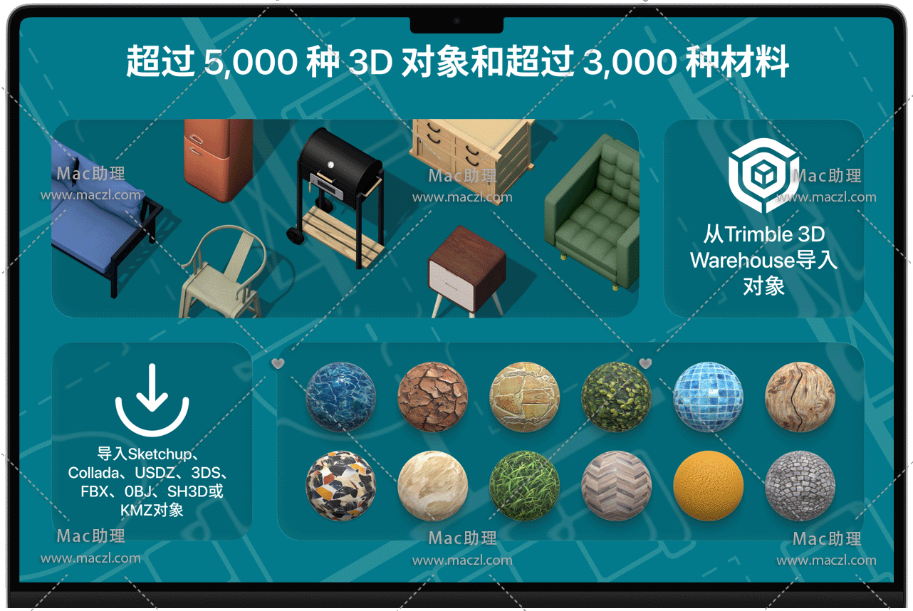 - 从 Trimble 3D Warehouse(之前称为 Google 3D Warehouse)无缝导入模型。