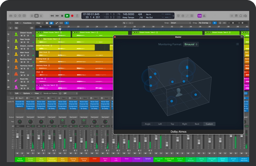 欢迎进入声音的全新维度。杜比全景声工具现已整合到位,让超越立体声境界,创建身临其境的空间音频混音效果,变得轻而易举。你可以为音乐添加生动的三维空间体验,并导出兼容 Apple Music 的杜比全景声文件。无论你身处配备杜比全景声多扬声器系统的录音棚,还是使用笔记本电脑通过 AirPods Max 对环绕声混音进行双声道监听,Logic Pro 能适应各种情况下的空间音频创作流程。