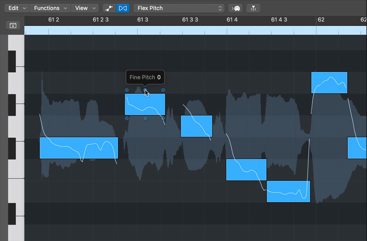 | Flex Pitch使用 Flex Pitch 可轻松快捷地编辑每个音符的音量和音高。滑动任一音符,所有的参数就会出现供你调整。