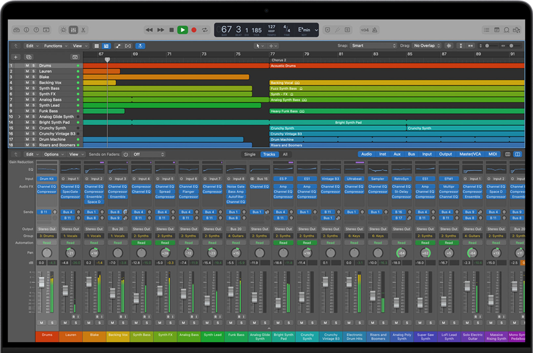 创建精确细腻的鼓乐器音轨,紧跟节拍混音并匹配音乐,高端技能多得是。在创作乐曲的过程中,Logic Pro能帮你整理所有创意灵感并加以甄选。你可以将相关音轨分组,试听备选版本,或合并多条音轨。还有点按并拖移伴奏功能,操作十分快捷,方便你利用多个片段合成最优演奏。