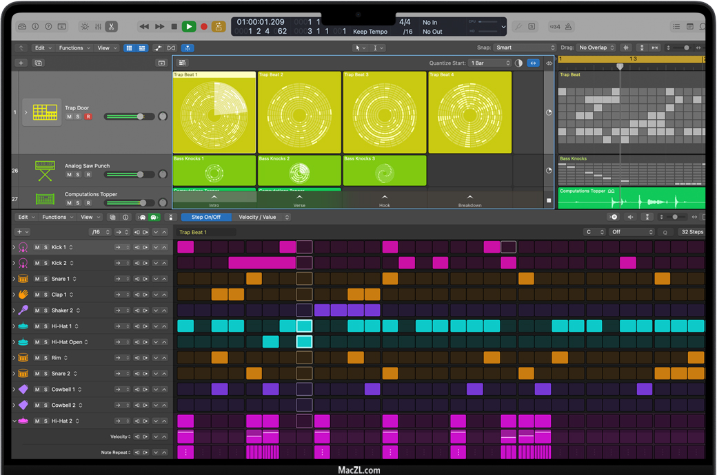Logic Pro超越一般音序器,拥有一整套进阶选项,便于你录音、编辑以及控制MIDI演奏。使用音符力度、时序、动态等基于片段的参数,将零散的演奏结合成一组严谨的音乐律动。借助智能量化功能,你也可以让 MIDI 演奏更为紧凑,同时还保留装饰音或分解和弦等音乐细节。