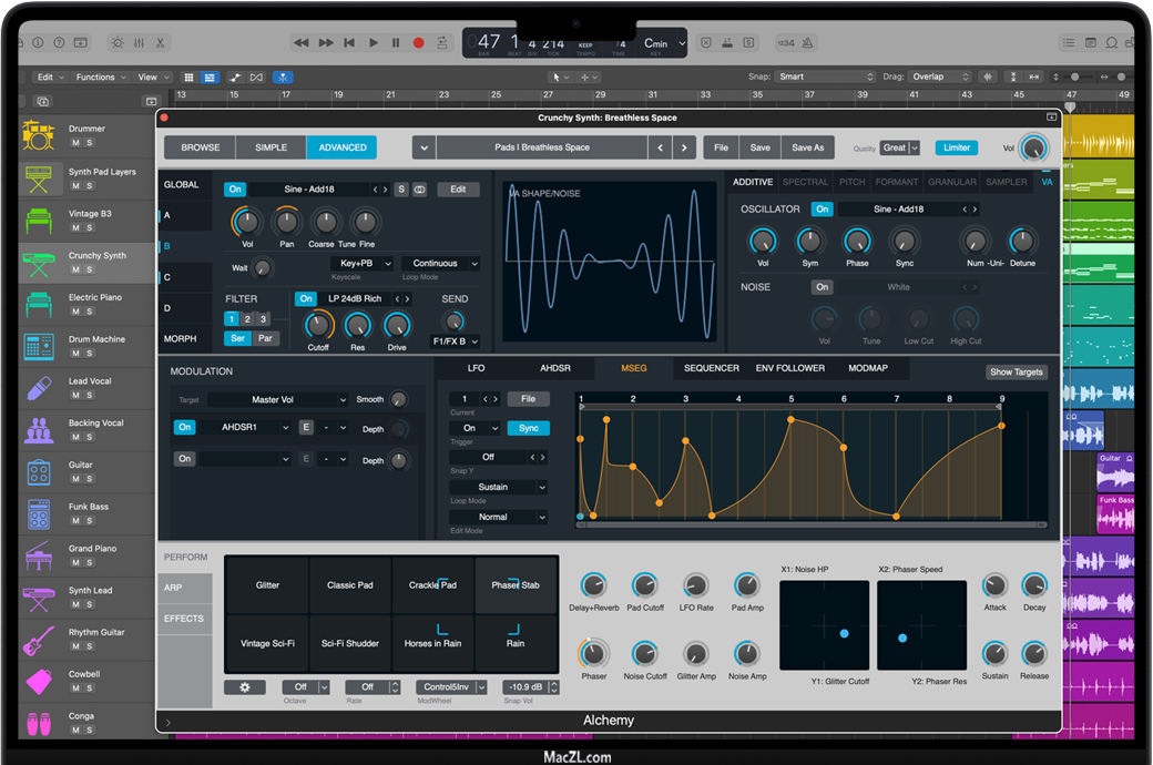 Logic Pro for Mac 内含一整套用于专业的音乐创作、节拍编制、编辑以及混音的先进创意工具,颇具现代感的界面设计可快速提供结果并在需要时提供更强大的功能。Logic Pro包含种类多样的乐器、效果、乐段和样本,形成了一个完整的工具包,可让您创作无比动听的音乐。