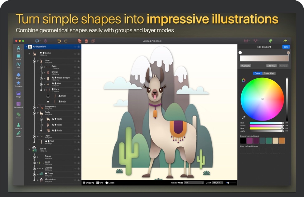 该应用程序的多种多样的综合形状,样式,预设,剪贴画和效果库很容易欣赏。凭借简洁的界面和强大的工具,包括可以根据需要进行组合的预制设计元素,Logistist 4提供了难以置信的易用性-甚至包括可用于创建所需形状的通用路径编辑器。