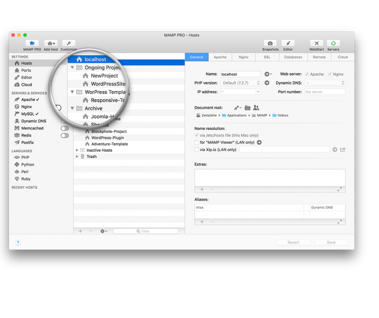 使用MAMP Pro,无需复杂的配置文件编辑即可设置工作测试环境。清洁分离,可以同时开发几个项目。为了能够尽可能多地代表各种ISP,可以在版本4和版本5之间的任何时间切换PHP以防止任何可能的不兼容性。只需点击几下鼠标,Mac上的登台服务器就可以通过MAMP Pro进行设置,这样您就可以随时了解您的客户和上级最新的项目状态。MAMP Pro的用户界面允许系统地启用或停用Apache模块。因此,您可以完美地模拟项目稍后运行的服务器环境,并保证项目的最高质量。