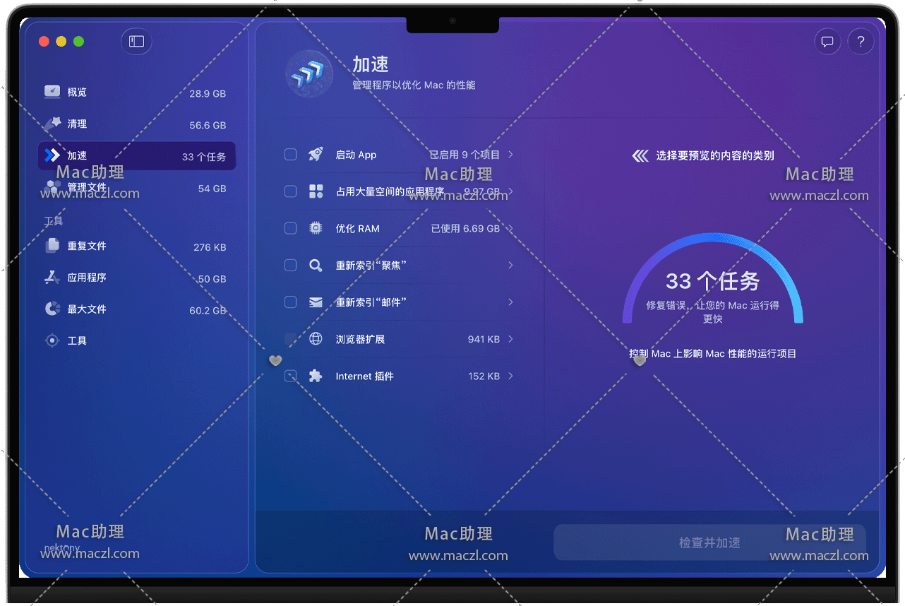 整合 “垃圾清理 + RAM 优化 + 启动项管理”,无需手动操作多个步骤。